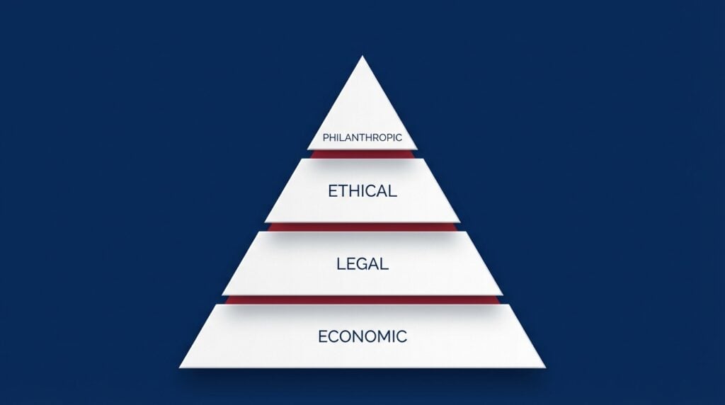 The four are economic, legal, ethical and philanthropic – Carroll’s pyramid frames them so companies can see the full scope of their duty.